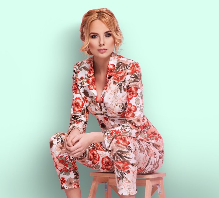 Kadın uzun kollu önden fermuarlı desenli iki iplik bluz ve pantolon ikili takım