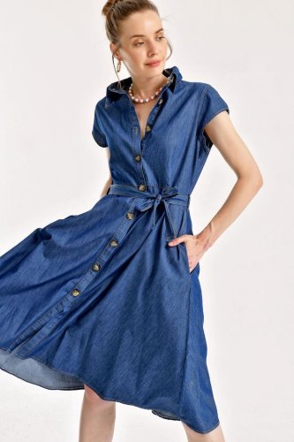 • 1677 Boydan Düğmeli Kuşaklı Kot Elbise Lacivert