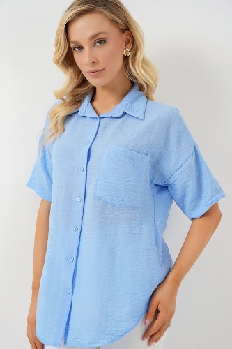 Kısa Kol Keten Görünümlü Gömlek 20336 Mavi
