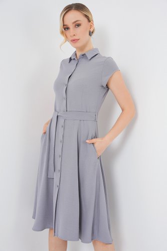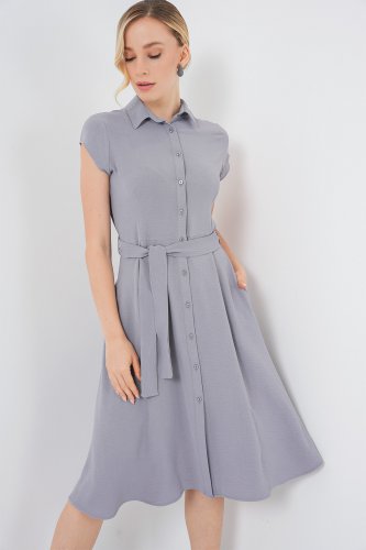 • 1677 Boydan Düğmeli Kuşaklı Elbise Gri