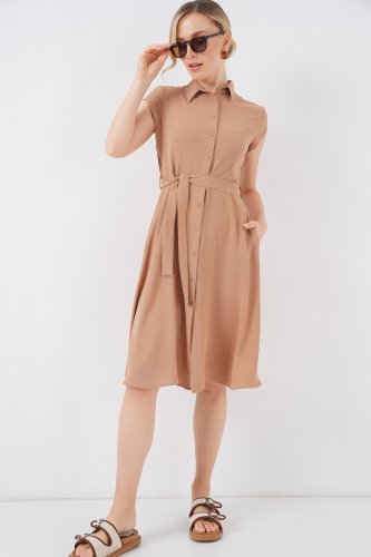1677 Boydan Düğmeli Kuşaklı Elbise Bisküvi