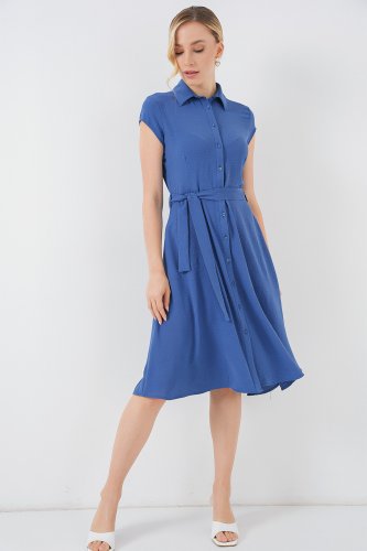 • 1677 Boydan Düğmeli Kuşaklı Elbise İndigo