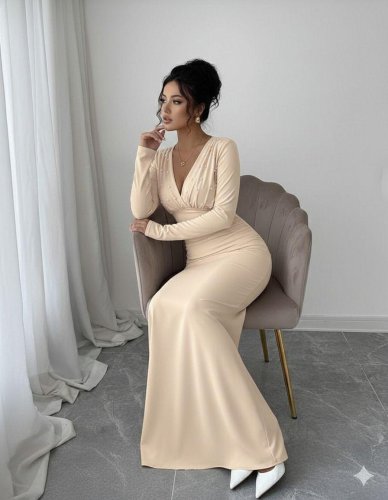 • Kadın uzun kollu derin v yaka inci detay maxi boy elbise