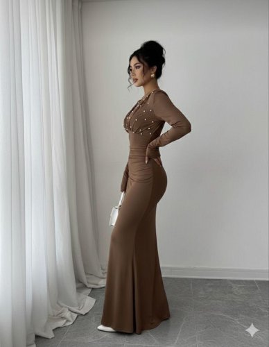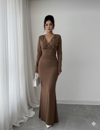 • Kadın uzun kollu derin v yaka inci detay maxi boy elbise