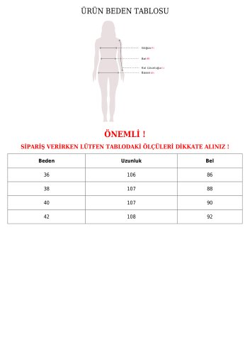 • Modelin Ölçüleri: Boy:165, Kilo:55, Göğüs:90, Bel:72, Kalça: 100
